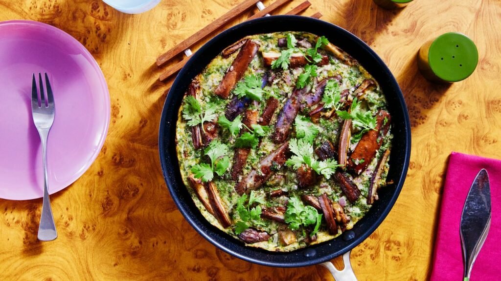 Devolver toda a berinjela à frigideira, adicione o restante 2 colheres de sopa. manteiga sem sale mexa até derreter. Despeje a mistura de ovos sobre a berinjela, reduza o fogo para médio-baixo e cozinhe, raspando e mexendo, até que a mistura de ovos esteja meio definida, cerca de 5 minutos. Superfície lisa e transferência da panela para o forno. Asse às fritadas até que seja tumulto e apenas ponha (ele deve balançar um pouco no centro quando abalado delicadamente), 8 a 10 minutos. Deixe esfriar 5 minutos.