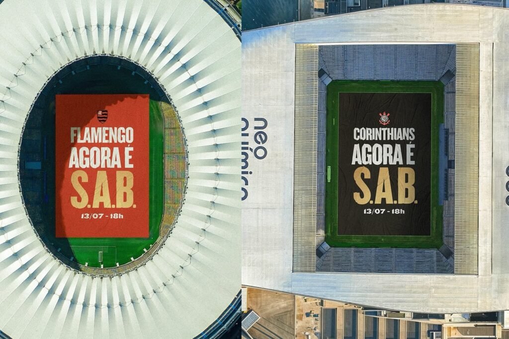 Ao menos dez times da Série A do Campeonato Brasileiro publicaram uma misteriosa foto em suas redes sociais neste domingo (13). No Instagram do Flamengo, uma imagem aérea mostra o gramado do Maracanã coberto pelo anúncio: “O Flamengo agora é SAB”.