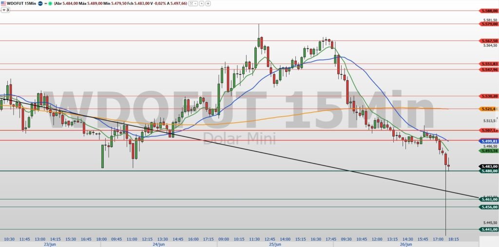 No gráfico de 15 minutos, o ativo voltou a apresentar fraqueza, encerrando o dia abaixo das médias móveis de 9 e 21 períodos. O minidólar testou novamente a região de 5.480, que se mostra um suporte de alta relevância no curtíssimo prazo.