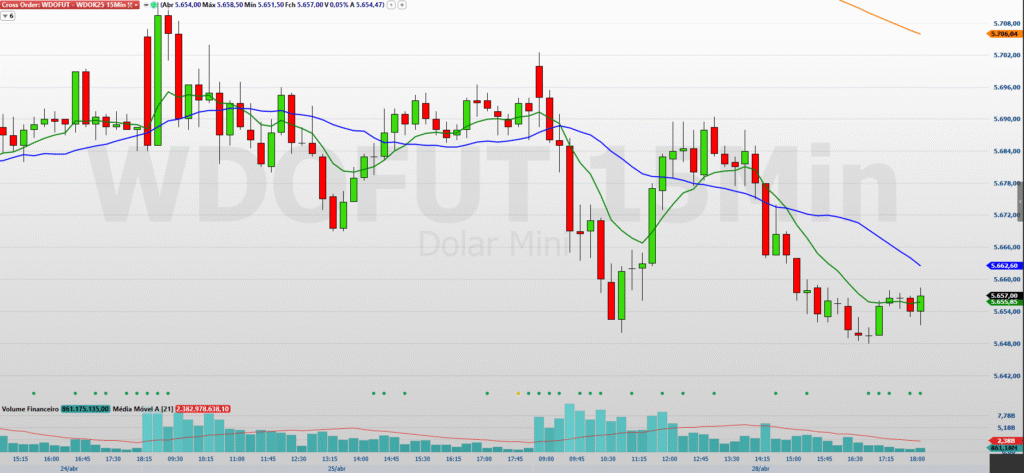 Já os contratos de minidólar (WDOK25), com vencimento em maio, fecharam a última sessão em queda de 0,61%, cotados a 5.657 pontos. Após leve recuperação na sexta-feira anterior, o ativo voltou a recuar, pressionado por fluxos de venda.