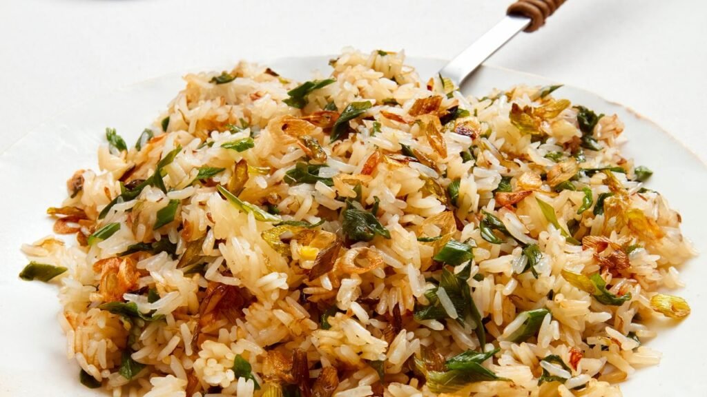 Todos nós temos nosso carboidrato de escolha e o meu é arroz. Eu como quase todos os dias, claro, como companheiro de ovos com azeitona, vegetais fritos, salmão assado lentamente e muito mais. Mas de vez em quando eu quero que meu arroz tenha um pouco mais de personalidade. Minha solução rápida: tempere com cebolinha – muitos deles.