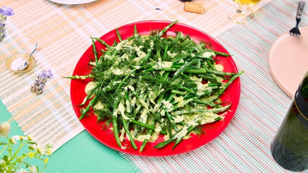 Adaptamos a receita dela levemente e a usamos como molho para este simples prato de verão. O título diz feijão verde, mas se você tiver acesso a uma variedade de cera ou corredor, ou mesmo Romano, feijão, fique à vontade para trocá -los em igual quantidade. Você vai querer usar o menor dente de alho que pode encontrar aqui para impedir que seu calor domine o molho de ervas.