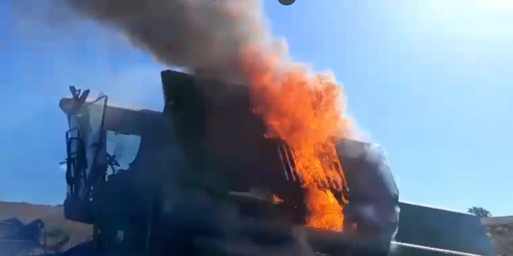 No mesmo vídeo, Cleiton registra a cena assustadora da colheitadeira em chamas descendo desgovernada por uma ribanceira. A máquina para em um barranco, em meio à mata, enquanto o fogo continua se alastrando.