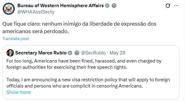 A publicação foi feita em resposta a um anúncio de Marco Rubio nesta quarta-feira, 28, de que o país vai restringir vistos para “autoridades estrangeiras e pessoas cúmplices na censura de americanos”.