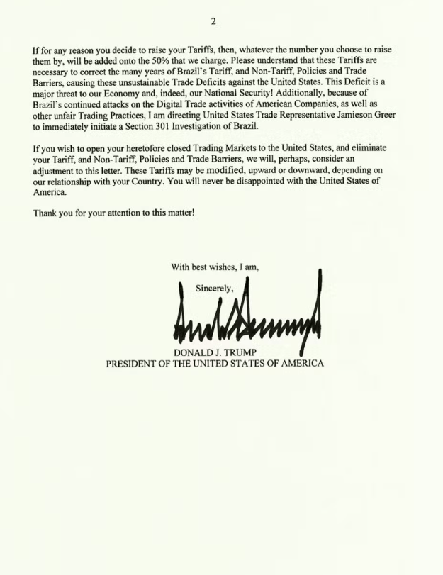 O governo Luiz Inácio Lula da Silva avisou nesta quarta-feira, dia 9, que devolve a carta por meio da qual o presidente dos Estados Unidos, Donald Trump, comunicou a imposição unilateral de tarifas de 50% sobre produtos importados do Brasil.