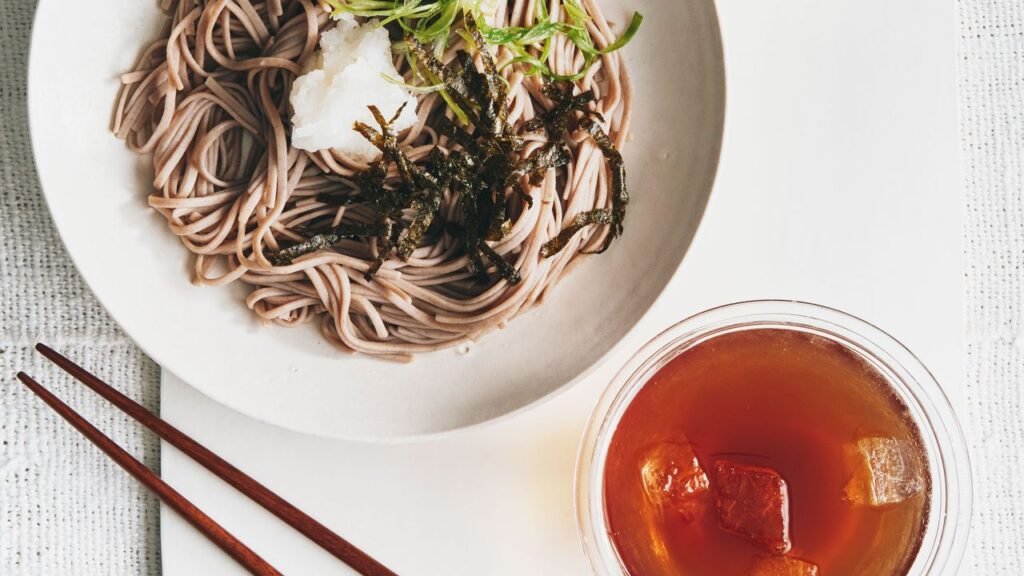 Em seguida, faça um Mentsuyu, uma base saborosa de sopa de macarrão. Agora você pode comprar Mentsuyu pré-fabricado e armazená-lo na geladeira para o Zaru Soba instantâneo. Mas fazê -lo em casa é realmente direto. Normalmente, Mentsuyu apresenta Dashi, Mirin, molho de soja e saquê. Para mantê-lo extremamente simples (e adequado para despensa), eu pulo o bem e minha família não é mais sábia. O Instant Dashi é um pó de umamibomb conveniente em que substituo o material caseiro. Servindo com alguns cubos de gelo dilui suavemente e prejudica intensamente a mistura, como um martini nas rochas. Eu gosto de superar meu soba com cebolinha fatiada, nori crocante, um aperto de wasabi e um monte de Daikon. Não pule o último – quando ralado, esse rabanete agridoce é como neve macia, derretendo no molho.