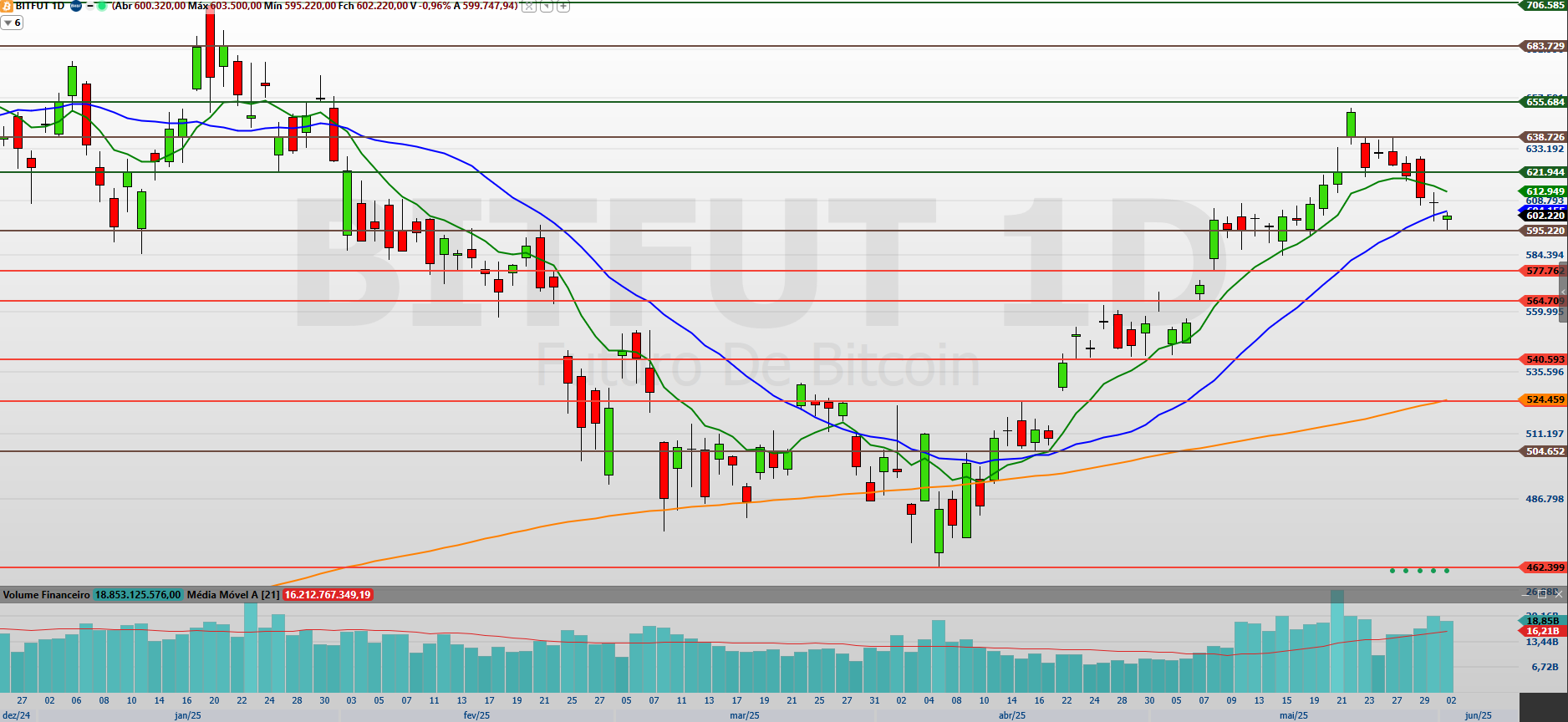 Os contratos futuros de Bitcoin (BITM25), com vencimento em junho, encerraram a sessão da última segunda-feira (2) em baixa de 0,96%, aos 602.220 pontos. Foi o quinto pregão consecutivo de queda, movimento que reforça o sinal de correção no curto prazo, embora a tendência de fundo ainda se mantenha altista.