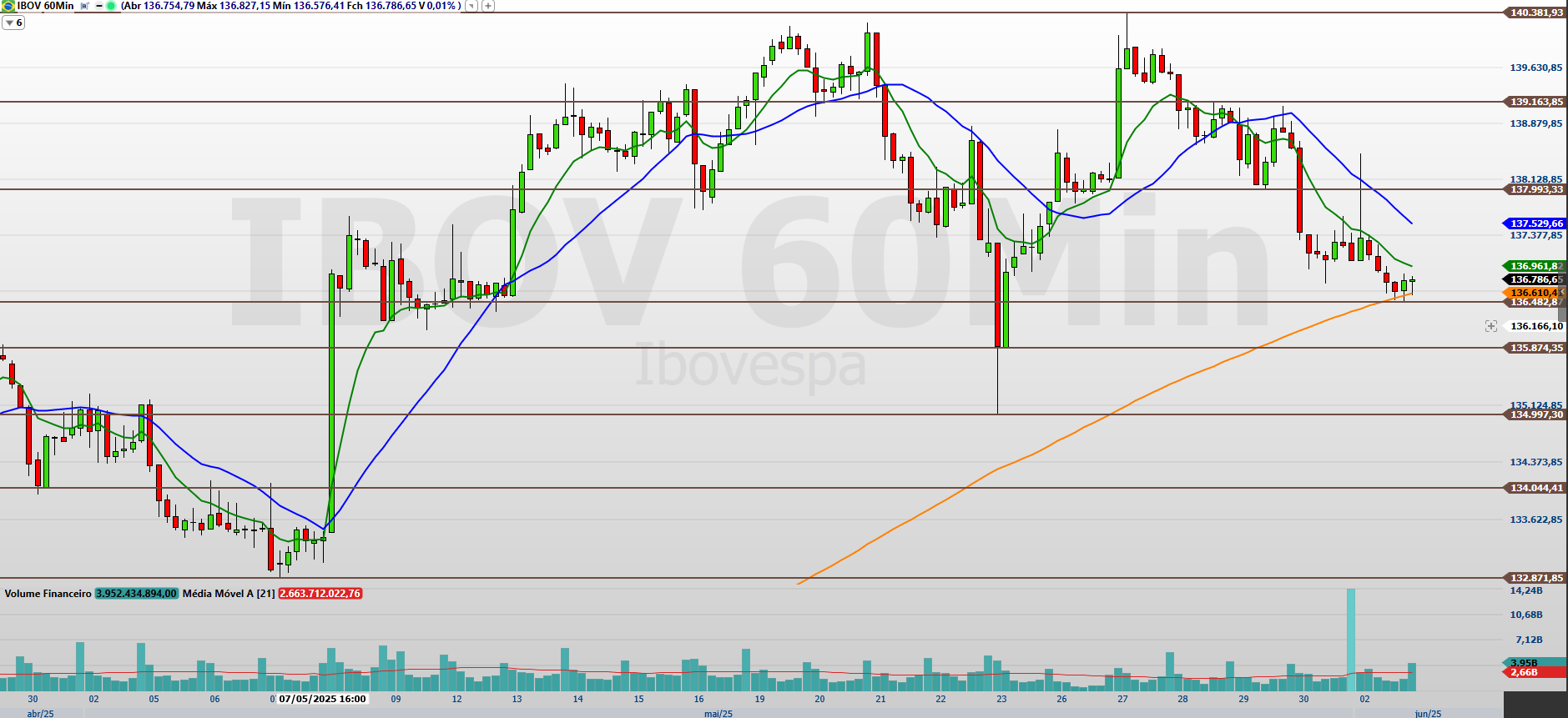 Para buscar uma reversão no intraday, o Ibovespa precisará superar a resistência imediata em 136.960/137.530 pontos. Se isso acontecer, há espaço para avanço até 137.990, 139.165 e 140.381 pontos, com projeções mais estendidas em 141.740 e 142.535 pontos.