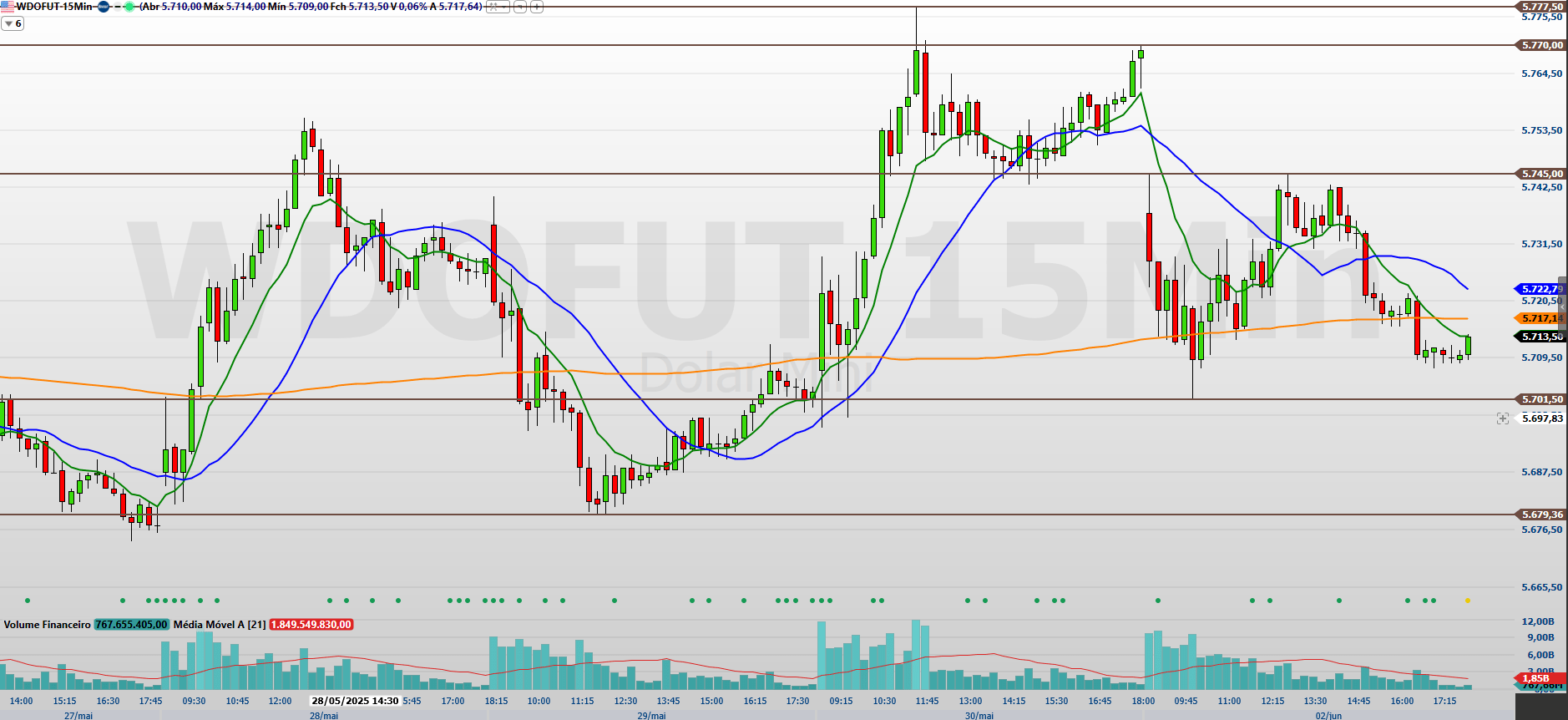 Os contratos de minidólar (WDON25), com vencimento em julho, encerraram a última sessão em queda de 0,96%, aos 5.713,5 pontos.