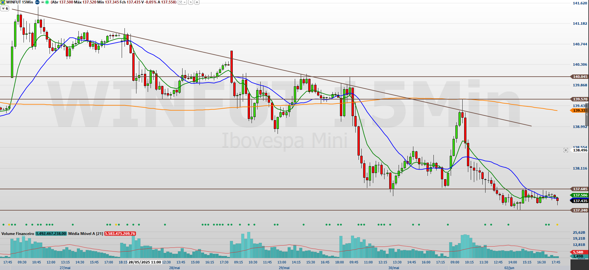 Os contratos do mini-índice (WINM25, vencimento em junho) encerraram a última sessão no campo negativo, com queda de 0,42%, cotados a 137.435 pontos. Com isso, acumula quatro sessões consecutivas de baixa, reforçando a pressão vendedora no curto prazo.