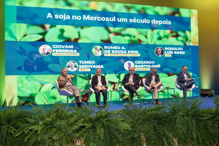 Moderado pelo jornalista Giovani Ferreira, do Canal Rural, o painel contou com Romeu Kiihl (MGS Melhoramento Genético e Sementes), considerado o pai da soja tropical; Tuneo Sediyama (UFV); Rodolfo Luis Rossi (AC Soja/Argentina); e Gerardo Bartolomé (Grupo Dom Mário/GDM).