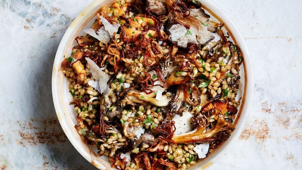 Os cogumelos carnudos complementam grãos de nozes e mastigáveis neste prato saboroso.