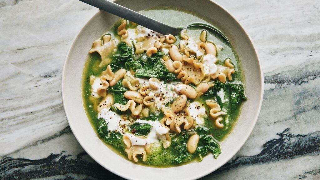 Aquecer 3 colheres de sopa. azeite extra-virgem em uma panela pesada média em alta alta. Adicionar 1 cebola média, picada grosseirae tempere com sal kosher. Cozinhe, mexendo ocasionalmente, até amolecer, cerca de 4 minutos. Adicionar 3 dentes de alho, fatias finase ½ colher de chá. flocos de pimenta vermelha triturados; Tempere com pimenta preta moída na hora. Cozinhe, mexendo com frequência, até perfumado, cerca de 1 minuto. Adicionar 4 xícaras de caldo de vegetais de baixo sódioAssim, 1½ colher de chá. Cristal de diamante ou 1 colher de chá. Morton Kosher Sale 3 xícaras de água e deixe ferver. Adicionar 12 onças. macarrão de trigo integral E cozinhe, mexendo ocasionalmente, até que seja muito al dente, cerca de 2 minutos a menos que as instruções da embalagem. Adicionar Dois 15,5 oz. latas de feijão branco, enxaguadoAssim, 2 onças. Parmesão, finamente raladoe permanecendo ½ couve, costelas e caules removidos, folhas grosseiramente cortadas. Reduza o fogo para médio e cozinhe, mexendo ocasionalmente, até que a couve fique macia e o feijão esteja aquecido, cerca de 2 minutos. Despeje o purê reservado e cozinhe, mexendo ocasionalmente, até combinar, mas a cor ainda estiver vibrante, cerca de 1 minuto. Retire do fogo e misture 3 colheres de sopa. suco de limão fresco.