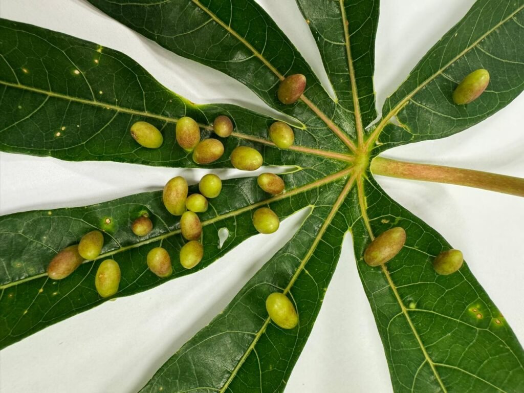 Como resultado, acontece a paralização do crescimento, perda da produtividade e, em casos severos, morte de plantas jovens. “Trata-se de pequenas moscas de coloração amarela que depositam ovos nas folhas, onde as larvas eclodem e começam a se alimentar do tecido foliar. A planta reage e forma as galhas ou verrugas”, explica ele.