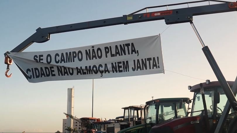 Os cartazes, em sua maioria, pedem o andamento do Projeto de Lei 320/25, o PL da Securitização, que prorroga as dívidas dos produtores rurais por um prazo de 20 anos e oferece melhores condições de pagamento.