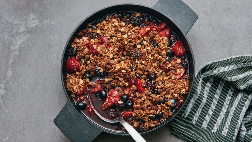 O truque para tornar essa sobremesa um caso livre de forno é fazer um fogão Streusel. Você apenas combina manteiga, farinha, açúcar mascavo, aveia, canela, sal e baunilha, então – em vez de assá -los – você os fritará em uma frigideira até se divertir. E para o recheio, uma variedade de bagas de sua escolha pode ser jogada juntas. Mirtilos, morangos e amoras são candidatos ideais, mantendo sua forma intocada enquanto cozinham. Apenas evite o uso de framboesas, que tendem a se voltar para a sopa assim que atingem a panela quente. E se você quiser usar congelado, basta aumentar a quantidade de amido de milho para 2 colheres de sopa para explicar sua textura um pouco mais aquosa.