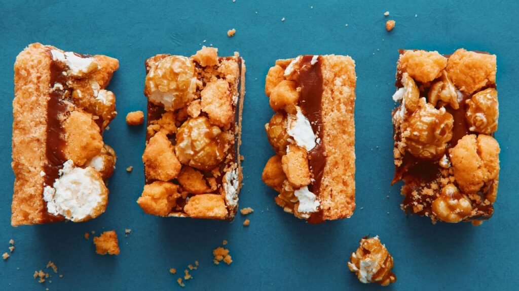A Windy City é famosa por muitas coisas – cachorros-quentes “arrastados pelo jardim”, o icônico bolo de chocolate de Portillo, pizza tão profunda quanto lasanha – mas talvez a minha favorita seja a pipoca ao estilo de Chicago. A mistura excêntrica de cheddar e milho caramelo é um alimento básico do meio-oeste, popularizado por Garrett Popcorn e adotado por seu equilíbrio perfeito entre sabores doces e salgados. Crescendo na área de Chicagoland, eu ansiava pela lata anual, abrindo meu queixo o máximo possível enquanto a engolia aos punhados. Essas barras emprestam a mesma combinação vencedora, reinventada em um biscoito adequado para as festas de fim de ano. O saboroso biscoito de cheddar tem função dupla, agindo como uma base crocante e ao mesmo tempo se esfarelando em uma cobertura semelhante a escombros ao lado de milho caramelo tufado. Uma espessa camada de caramelo em borracha mantém tudo unido. É um presente inesperado que certamente roubará a cena.