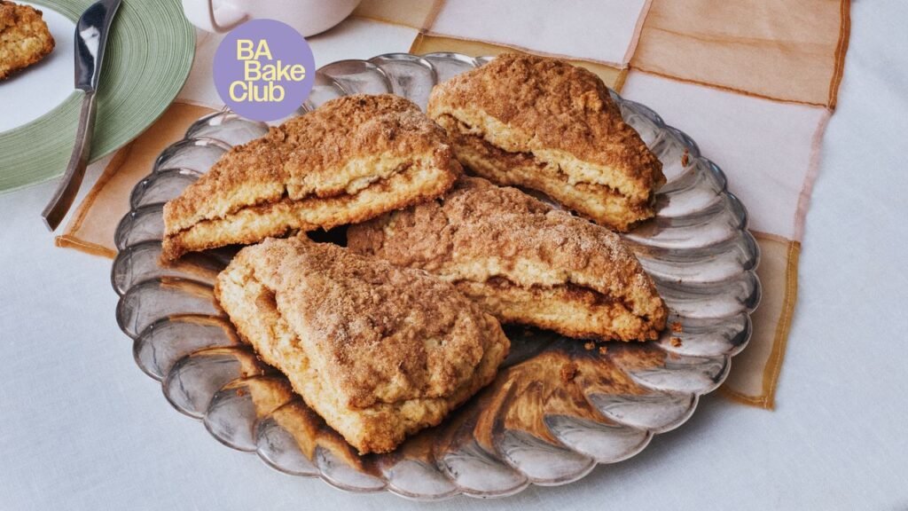 Esse. Este é o nosso bolinho ideal agora. Conhecedor e picante de creme de leite, mas não tão rico que um tapinha de manteiga estaria errado, caso o desejasse. Cortar em triângulos desequilibrados produz a melhor proporção de vantagem / insensível. E uma vez que descobrimos uma base com a qual estávamos realmente felizes, decidimos que simplesmente não era suficiente. Por que deixar um bom bolinho em paz quando você pode catapultá -lo em seu próprio Hall of Fame? Uma fita de açúcar de canela e o topper de streusel crocante – ambos emprestados de bolo de café, outro bem assado emparelhado clássico com uma bebida quente – fez isso um favorito da equipe instantânea.