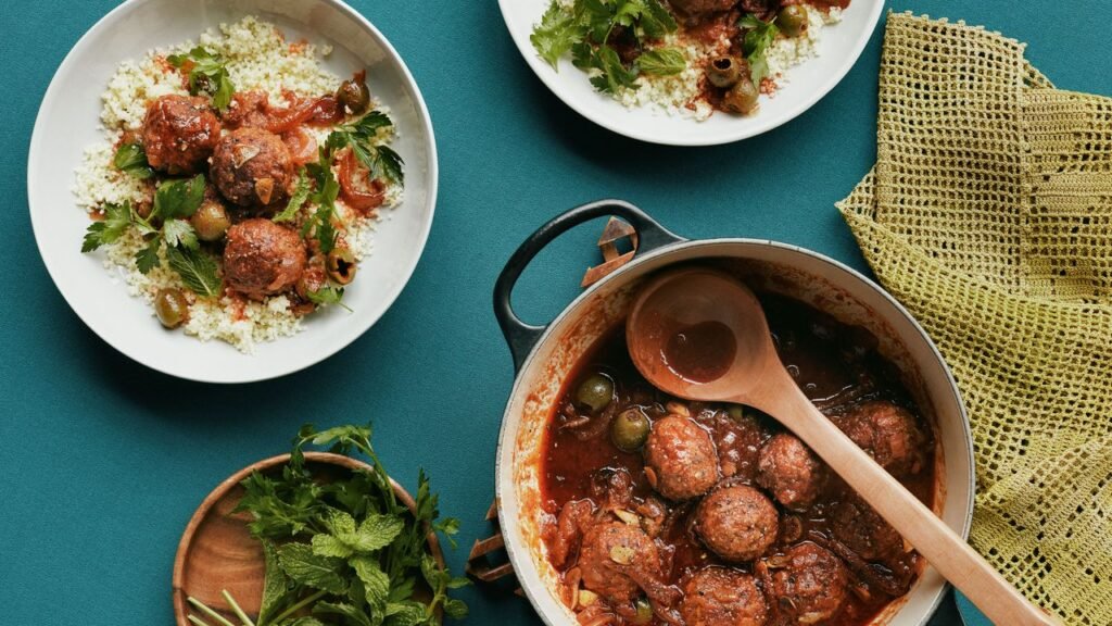 Nesta visão da semana, a visão de tag-sagine marroquino tags clássicos de sabores de sabor para criar o molho robusto: harissa pimenta (se a sua for suave, você deseja colocar uma pitada de flocos de pimenta vermelha esmagados para equilíbrio), frutas secas doces, azeitonas salgadas e especiarias quentes, como canela e cuminagem. Se o cordeiro não for sua bolsa, fique à vontade para trocar de carne moída ou frango.