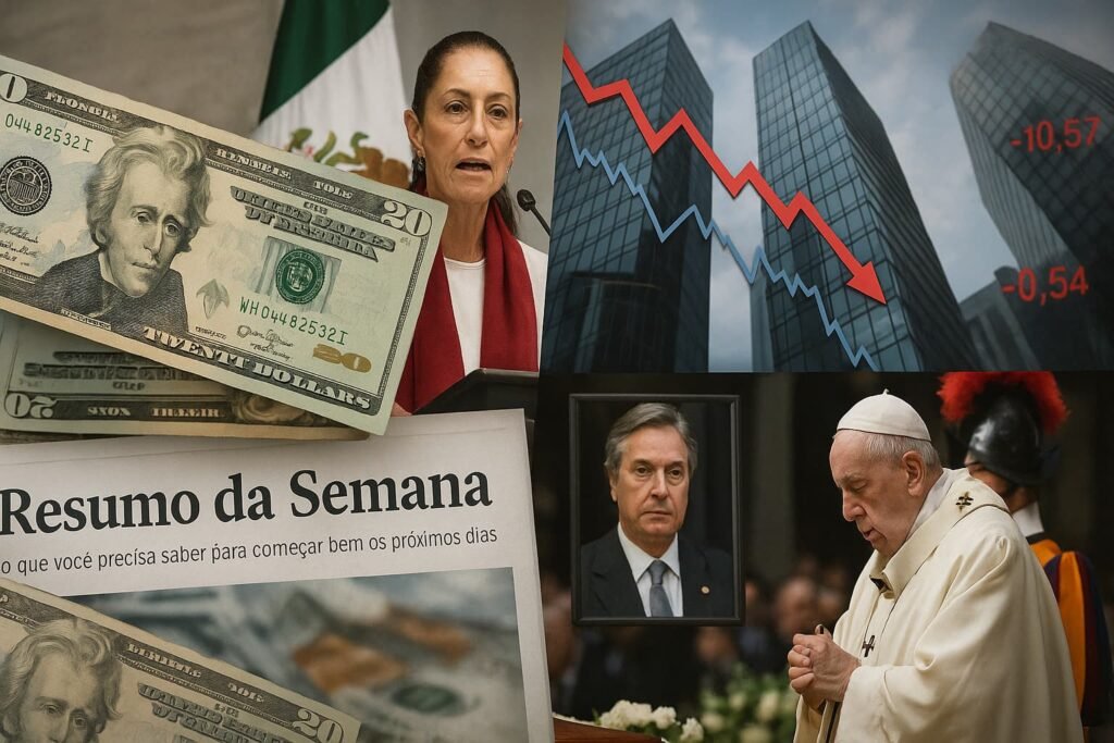 A semana foi marcada por movimentos importantes na economia, política e cenário internacional. O dólar continuou sua trajetória de queda e atingiu o menor patamar desde 2022, enquanto no setor empresarial, ações de grandes companhias europeias sofreram forte desvalorização após mudanças no Brasil. No campo político, o Supremo Tribunal Federal (STF) decidiu pela manutenção da prisão do ex-presidente Fernando Collor. No exterior, a presidente mexicana Claudia Sheinbaum reforçou o interesse em estreitar relações com o Brasil, e o mundo se despediu do Papa Francisco, em uma cerimônia histórica.