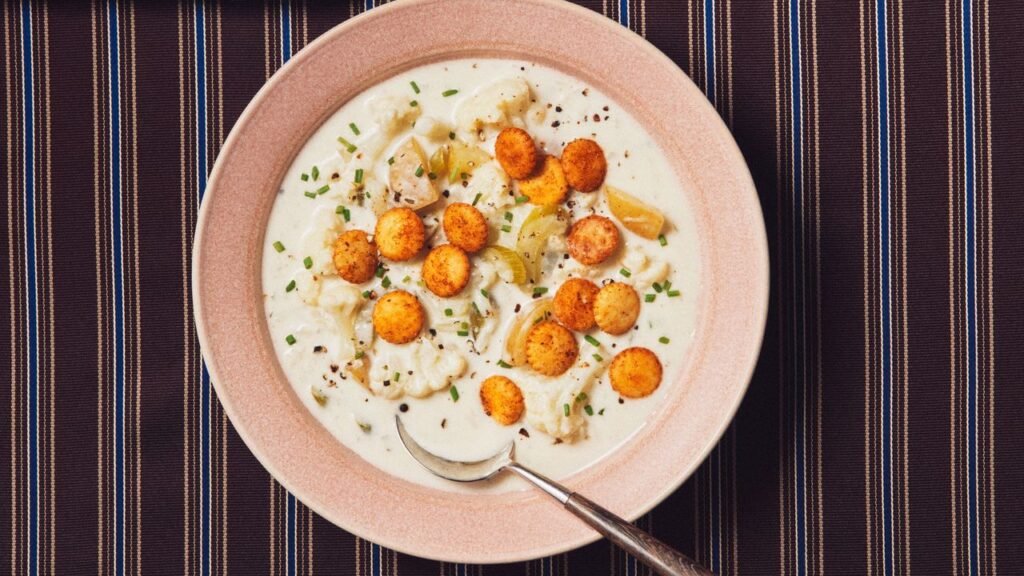 Polvilhe ¼ xícara de farinha para todos os fins Sobre a mistura de cebola e cozinhe, mexendo, 1 minuto para brindar levemente. Adicionar 1 Cabeça pequena de couve -flor (cerca de 1 lb.), aparada, cortada em pequenas florzinhasAssim, 8 Baby Yukon Gold Batata (cerca de 10 onças), esfregado, cada um corte em oitavosAssim, 1½ xícaras de creme de leitee 5 xícaras de água. Leve para ferver e cozinhe, mexendo ocasionalmente, até que a couve -flor e as batatas fiquem macias e o líquido esteja levemente espessado, 20 a 25 minutos.