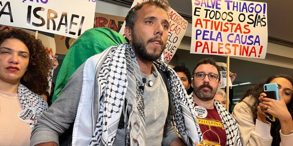 Thiago desembarcou no Aeroporto Internacional de Guarulhos, em São Paulo, e foi recebido por um grupo de militantes pró-Palestina, portando cartazes com mensagens de apoio ao país e bandeiras.