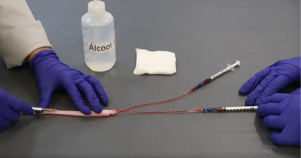 “Os modelos similares disponíveis no mercado são importados e possuem custos elevados de aquisição e manutenção. Isso inviabiliza sua aplicação em turmas grandes, nas quais cada aluno deve ter acesso individual ao modelo para praticar”, explica Zanatto. O novo modelo simula com precisão a anatomia de uma cauda real, com veias laterais representadas por um tubo em formato de U, preenchido com sangue artificial. Produzido com silicone translúcido, o dispositivo permite que os alunos pratiquem punções venosas com mais segurança e menos impacto emocional.
